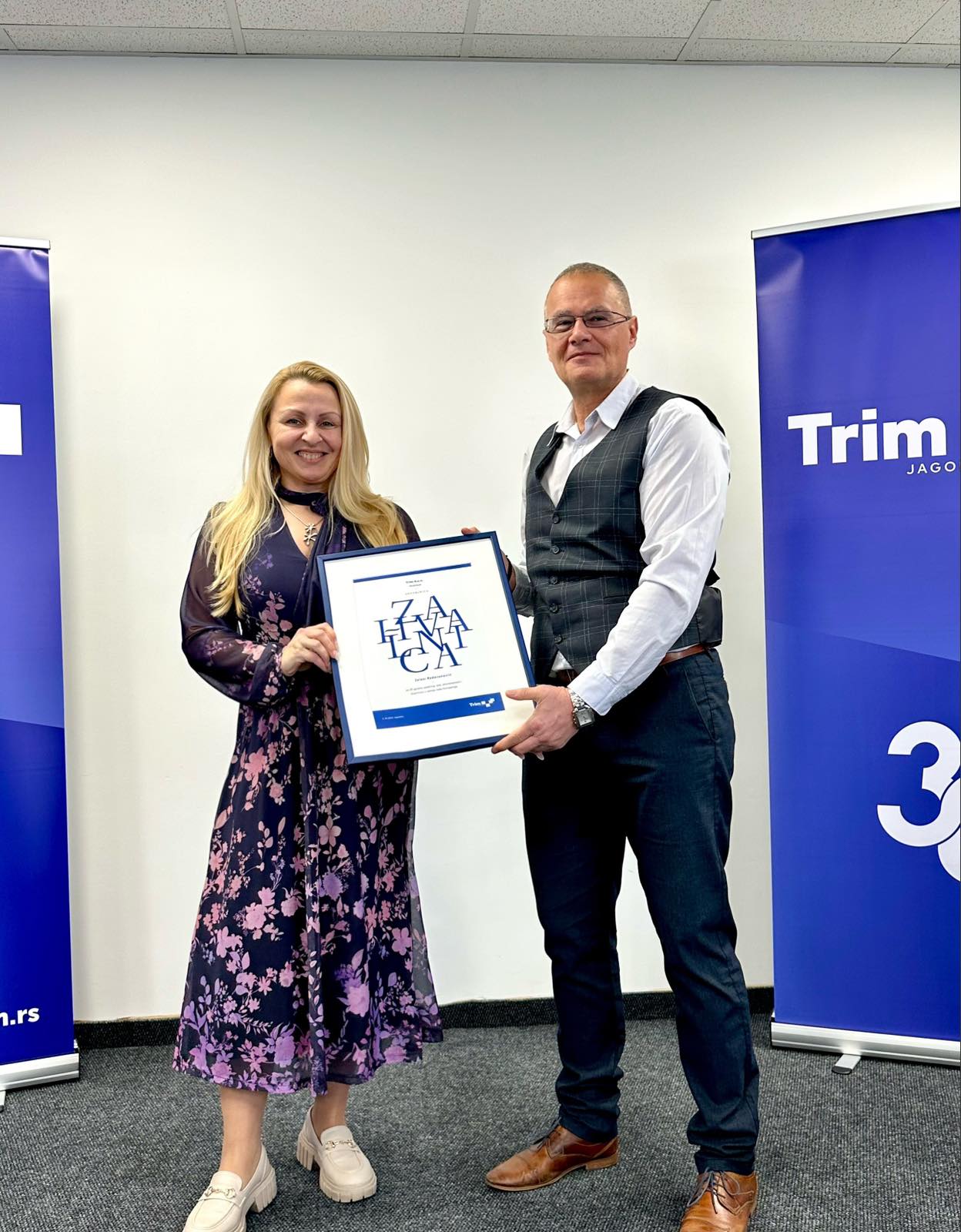 Dobitnici jubilarnih nagrada su Svetlana Vukmanović, Jelena Radovanović i Dušan Milošević, za 20 godina rada u kompaniji Trim. Čestitamo!